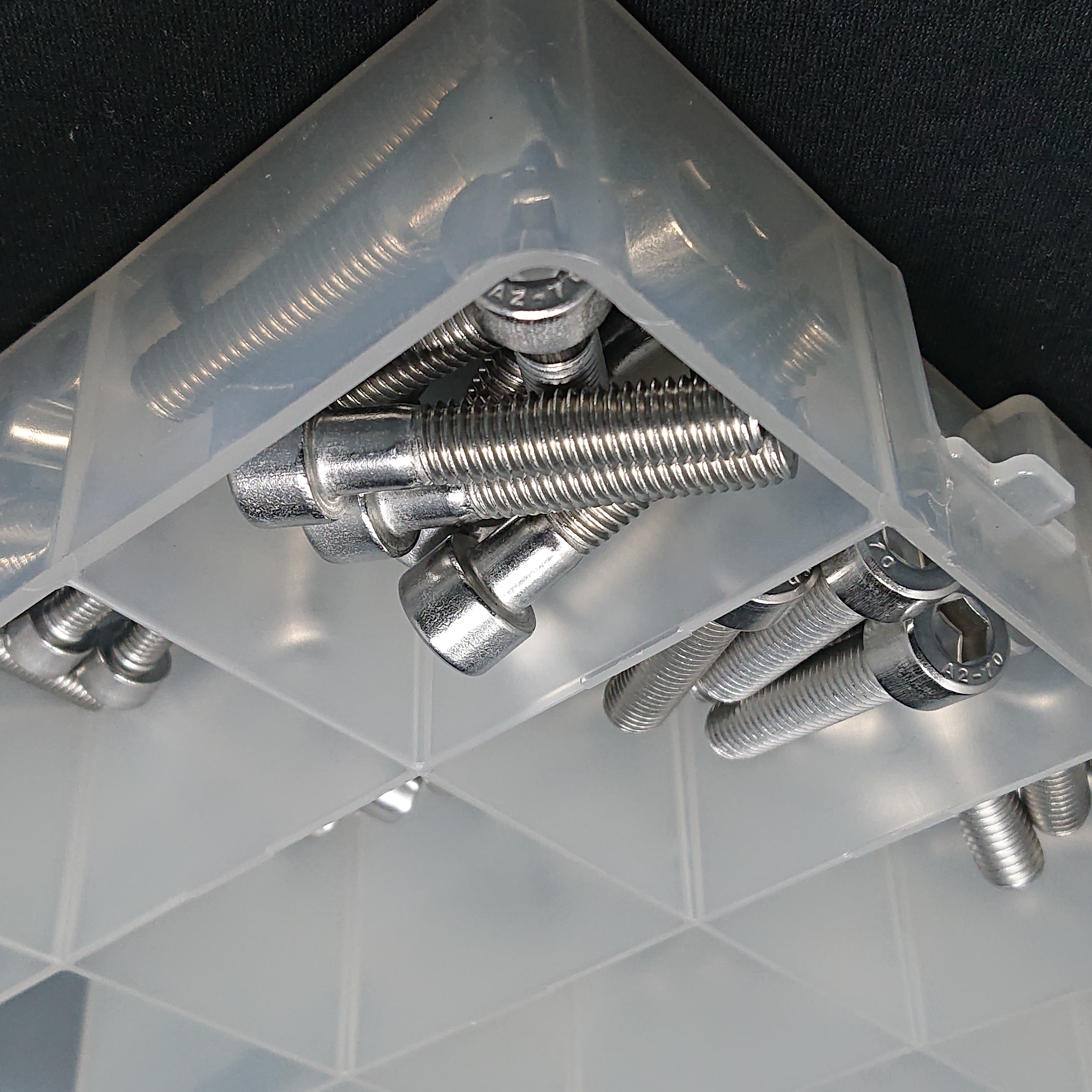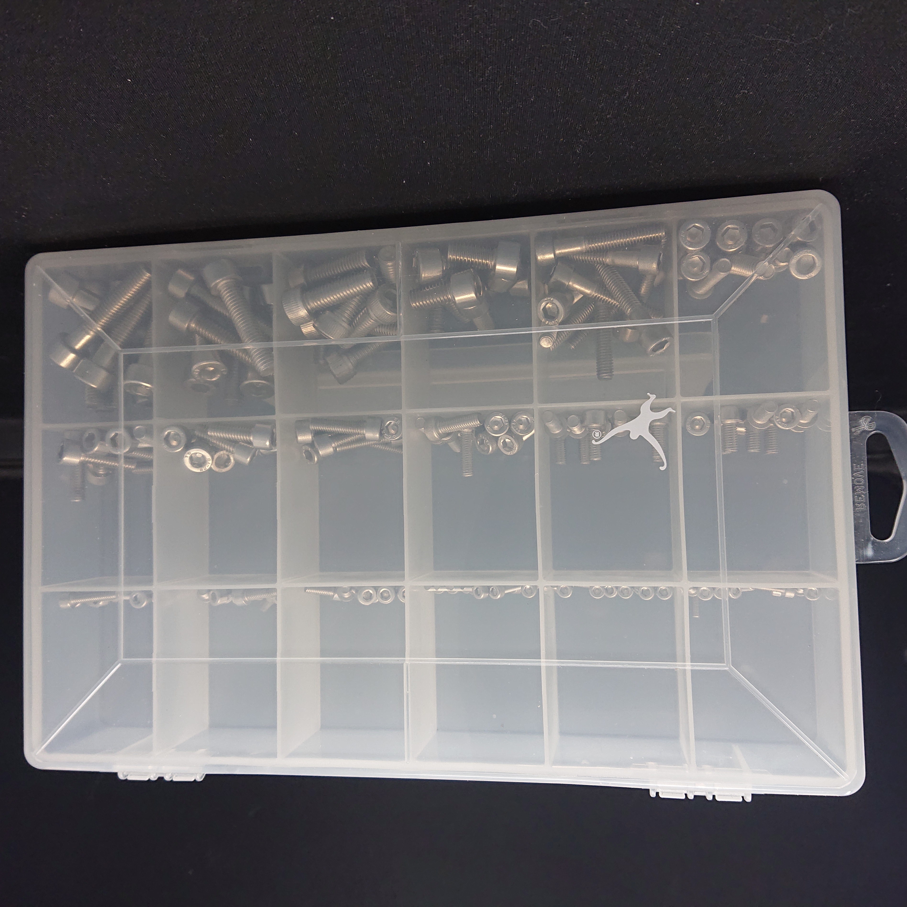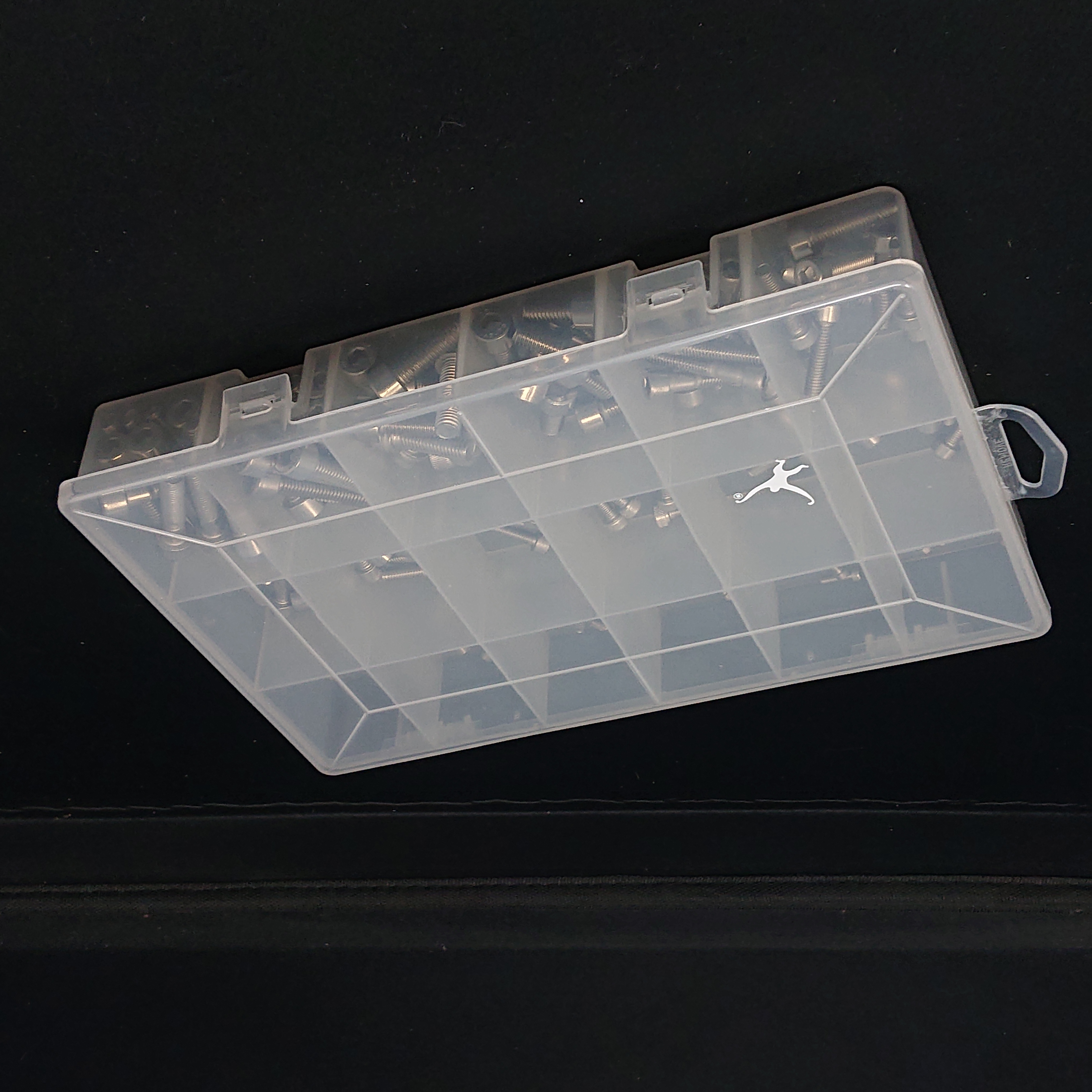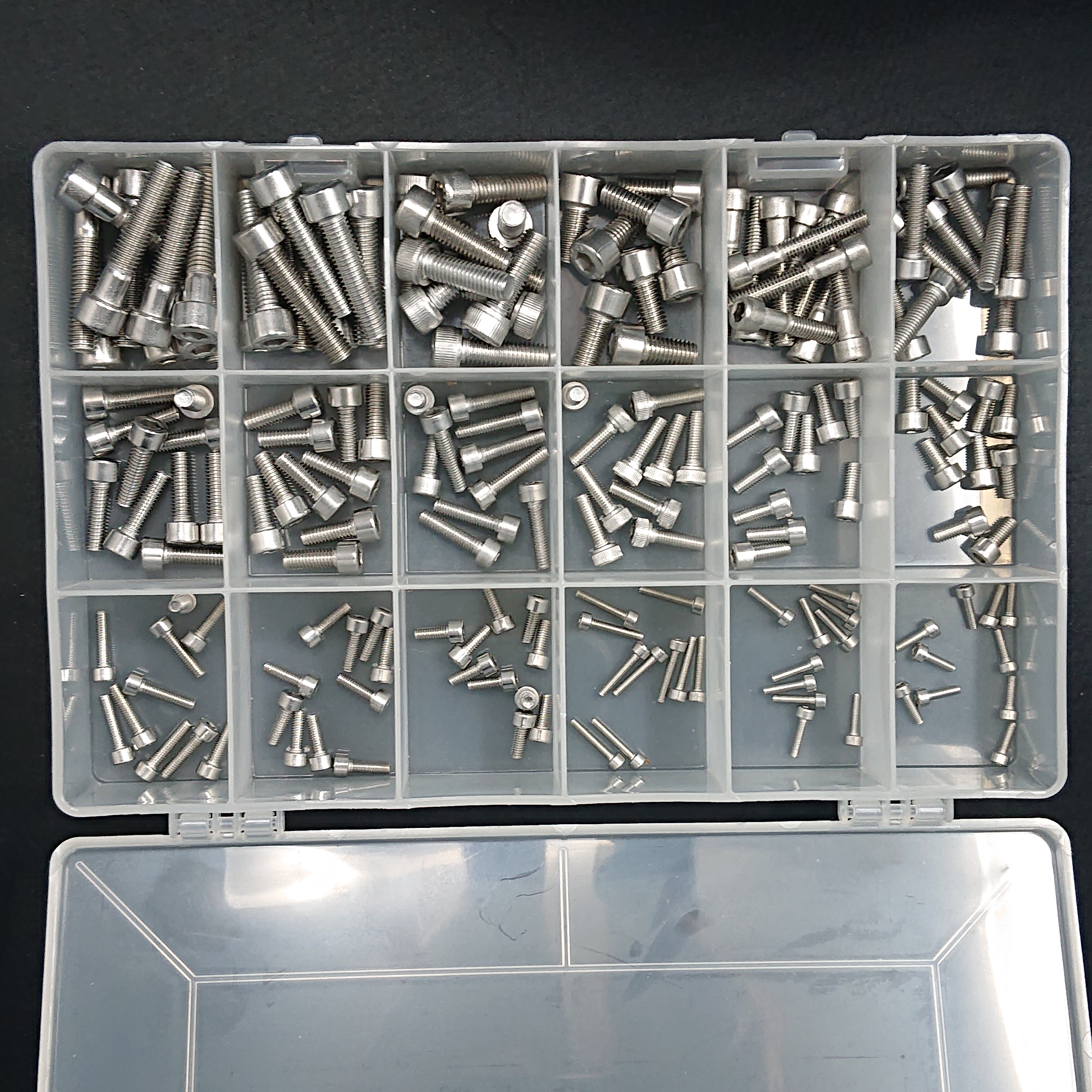 A 26 x 17 x 4.5 cm organiser box filled with a selection of the most popular lengths of M3 (3mm thread diameter,) M4 (4mm) M5 (5mm,) M6 (6mm) and M8 (8mm) socket cap screws.